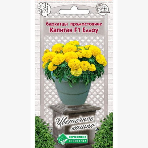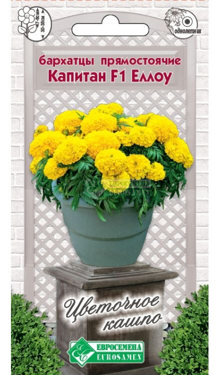 Бархатцы — любимые всеми цветы, которые дарят людям свою красоту и поднимают настроение яркими красками на протяжении всего лета. К тому же они неприхотливы. Родина их — американский континент. Бархатцами цветы назвали за нежные бархатистые лепестки. Капитан- это новый раннецветущий гибрид бархатцев с очень компактным габитусом растений и очень плотной листвой. Растение обладает большой устойчивостью к непогоде. Цветок яркий, насыщенного желтого цвета, плотный, с высокой степенью махровости. Гибрид отличается хорошим боковым ветвлением, роскошным и продолжительным цветением, не теряет своей декоративности до осенних заморозков. Идеальный вариант для оформления клумб, рабаток, а самое главное, для посадок в кашпо, контейнеры и вазоны. Они прекрасно держат форму, не разваливаются от ветра и дождя, стойко переносят понижение температуры без ущерба для красоты своих соцветий, что позволяет с успехом комбинировать их в различных композициях.