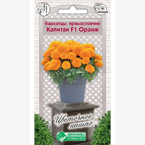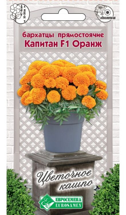 Бархатцы — любимые всеми цветы, которые дарят людям свою красоту и поднимают настроение яркими красками на протяжении всего лета. К тому же они неприхотливы. Родина их — американский континент. Бархатцами цветы назвали за нежные бархатистые лепестки. Капитан- это новый раннецветущий гибрид бархатцев с очень компактным габитусом растений и очень плотной листвой. Растение обладает большой устойчивостью к непогоде. Цветок яркий, насыщенного оранжевого цвета, плотный, с высокой степенью махровости. Гибрид отличается хорошим боковым ветвлением, роскошным и продолжительным цветением, не теряет своей декоративности до осенних заморозков. Идеальный вариант для оформления клумб, рабаток, а самое главное, для посадок в кашпо, контейнеры и вазоны. Они прекрасно держат форму, не разваливаются от ветра и дождя, стойко переносят понижение температуры без ущерба для красоты своих соцветий, что позволяет с успехом комбинировать их в различных композициях.