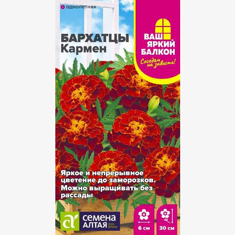 Яркие бутоны этого низкорослого сорта бархатцев будут украшать Ваш балкон или сад. Куст высотой до 30 см в период цветения покрывается яркими красно-тициановыми с золотистой каймой цветками, собранными в гвоздиковидные соцветия до 4-6 см в диаметре. Отлично смотрится в оформлении балконных ящиков, вазонов. Прекрасно подойдёт для заполнения промежутков между более высокорослыми растениями, для оформления клумб, бордюров. Неприхотливое, засухоустойчивое и светолюбивое растение, выносит небольшое затенение. Заморозков не переносит. Наибольшей декоративности достигает на открытых солнечных участках с питательными нейтральными суглинистыми почвами. Посев семян на рассаду проводят в марте. Глубина заделки семян 0,5 см. Посевы накрывают черной плёнкой для поддержания необходимого уровня влажности. При температуре +20-22°С всходы появляются через 7-10 дней, пленку убирают, температуру понижают до +16-18°С, во избежание вытягивания рассады. В грунт высаживают, когда минует угроза заморозков. Схема посадки 20х30 см. Цветение – через 2-2,5 месяца от посева, с июня до заморозков. В районах с мягким климатом возможен посев семян в открытый грунт в мае на глубину 1,0-1,5 см.