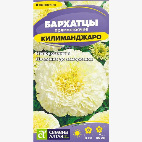 Великолепный сорт с махровыми соцветиями необычной эффектной окраски. Растение образует куст высотой до 45 см с выраженным главным стеблем. Соцветия крупные густомахровые ванильно-белой окраски. Используется для групповых посадок, рабаток, а также для срезки и оформления букетов. Неприхотливое, засухоустойчивое и светолюбивое растение, выносит небольшое затенение. Заморозков не переносит. Наибольшей декоративности достигает на открытых солнечных участках с питательными нейтральными суглинистыми почвами. Посев семян на рассаду проводят в марте. Глубина заделки семян 0,5 см. Посевы накрывают плёнкой для поддержания необходимого уровня влажности. При температуре +20-22°С всходы появляются через 7-14 дней, затем пленку убирают, температуру понижают до +16-18°С, во избежание вытягивания рассады. Когда минует угроза возвратных заморозков проводят высадку в открытый грунт. Схема посадки 30х50 см. Цветение – через 2-2,5 месяца от посева, с июня до заморозков. В районах с мягким климатом возможен посев семян в открытый грунт в мае на глубину 1,0-1,5 см.