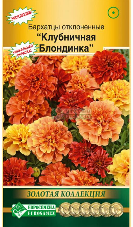 Бархатцы отклоненные (или французские) занимают лидирующие позиции по популярности среди садоводов. Они культивируются по всему миру, используются в декоративном садоводстве, кулинарии, косметической промышленности и медицине. Их популярность обусловлена красотой соцветий, неприхотливостью и простотой выращивания, это наиболее часто встречающийся летник на дачных участках. Клубничная блондинка-летник премиум-класса, настоящий эксклюзивный сорт с уникальной палитрой окраски цветков на 1 растении в течение вегетации, цветок-хамелеон! Окраска первых цветков красно-коричневая с желтым, в дальнейшем окраска меняется на розовую, а еще позднее- на соломенно-желтую. Хорошо ветвящийся от основания кустик стойко переносит непогоду, не разваливается от порывов ветра, сильных дождей. Прекрасно растет в балконных и садовых контейнерах, чрезвычайно декоративен и в вазонах. В открытом грунте растения хороши в бордюрах, массивами на рабатках, по переднему краю сборных цветников. Высота растения-25-30 см Диаметр цветка-6 см