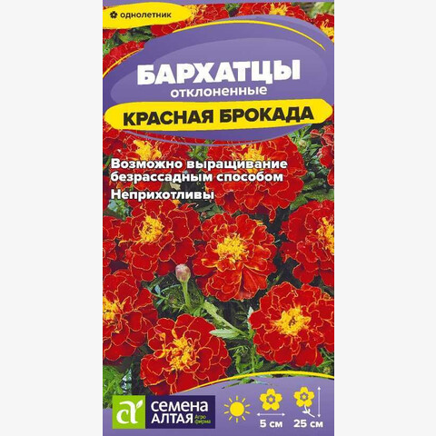 Яркий декоративный однолетник. Образует компактный густооблиственный кустик высотой до 25 см. Соцветия гвоздиковидные идеальной формы, огненно-красные. Диаметр корзинки 4-5 см, в центре небольшой хохолок из трубчатых цветков. Является отличным украшением парадных цветников, клумб, вазонов, балконных ящиков. Также выращивают среди посадок огородных растений для отпугивания вредителей. Неприхотливое, засухоустойчивое и светолюбивое растение, выносит небольшое затенение. Заморозков не переносит. Наибольшей декоративности достигает на открытых солнечных участках с питательными нейтральными суглинистыми почвами. Посев семян на рассаду проводят в марте. Глубина заделки семян 0,5 см. Посевы накрывают черной плёнкой для поддержания необходимого уровня влажности. При температуре +20-22°С всходы появляются через 7-10 дней, пленку убирают, температуру понижают до +16-18°С, во избежание вытягивания рассады. В грунт высаживают, когда минует угроза заморозков. Схема посадки 20х30 см. Цветение – через 2-2,5 месяца от посева, с июня до заморозков. В районах с мягким климатом возможен посев семян в открытый грунт в мае на глубину 1,0-1,5 см.