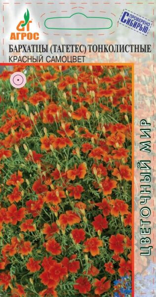 Однолетник с огромным количеством мелких темно-красных соцветий диаметром 2-3 см. Растение изящное, цветение длительное. Причем бутоны и молодые цветки находятся на периферии куста, а отцветшие – внутри, что придает растению постоянно свежий и аккуратный вид. Бархатцы тонколистные обладают своеобразным, сильным и приятным ароматом. Бархатцы неприхотливые, быстрорастущие, засухоустойчивые и светолюбивые растения, но выносят небольшое затенение, поэтому ими можно оформлять участки с северной стороны строений. Зацветают через 2 месяца после посева. Семена на рассаду высевают в начале апреля, но для более раннего цветения их можно посеять в марте. В грунт высаживают, когда минует угроза заморозков. Всходы появляются через 10-14 дней. Бархатцы гармонично выглядят в любых цветниках. Их можно использовать в контейнерах и корзинах, высаживать в балконные ящики. Кроме того, бархатцы оказывают санитарное воздействие на почву. Хорошо и долго стоят в срезке. 25-30 III-IV V V-VI 30x30 VI-IX