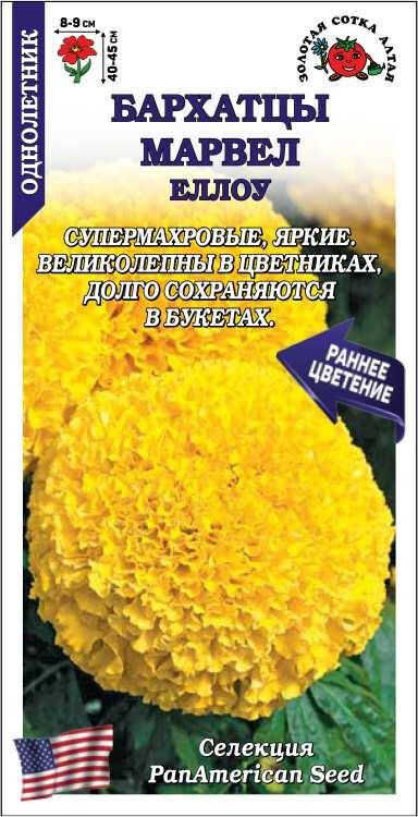Бархатцы серии Марвел развиваются быстро, начинают цвести раньше аналогов, обильно цветут до заморозков и устойчивы к непогоде. Растения плотные, компактные, с большим количеством крепких цветоносов. Соцветия привлекательного лимонно-желтого цвета, крупные, супермахровые, стойкие к выгоранию. Бархатцы данной серии великолепны в цветниках, долго сохраняются в букетах, подходят для крупных контейнеров.