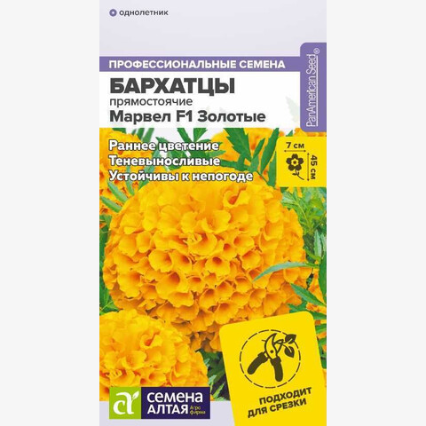 Гибрид, характеризующийся ранним и длительным цветением, особой насыщенностью окрасок, выравненностью габитуса, а также высокой погодоустойчивостью. Растения хорошо себя чувствуют в полутени, в условиях короткого светового дня зацветает быстрее. Формирует прочные цветоносы и крупные шарообразные цветки с плотными лепестками золотисто-желтого цвета. Долго сохраняет декоративность в срезке. Идеально подходит для ландшафтного озеленения. Высота растения: 35-45 см Диаметр цветка: 7 см Условия выращивания, место посадки: солнечные участки, полутень Требования к грунту: питательный легкий грунт с нейтральной реакцией среды Способы выращивания: рассадный, безрассадный Время посева на рассаду: март-апрель Время посева в грунт: май Способ посева: семена высевают на уплотненное ложе замоченных торфяных таблеток или увлажненного грунта, заделывая на глубину 0,4-1 см. Увлажняют из опрыскивателя. Емкость накрывают прозрачной крышкой или пленкой до появления первых всходов, периодически проветривают. При раннем посеве на рассаду обеспечивают досветку 8-10 часов при температуре 20-22°С. После появления всходов температуру снижают до 16-18°С. Время до появления всходов: 4-8 дней Перевалка: производится через 2-3 недели от появления всходов. Объем индивидуальных емкостей при доращивании не менее 0,5 л Время высадки в открытый грунт: май-июнь, когда минует угроза возвратных заморозков Посадочное расстояние: 20-25 см Период цветения: июнь-октябрь Уход: размещение посевов в прохладном помещении. Первую подкормку комплексным минеральным удобрением проводят через 5 дней после перевалки в отдельные емкости. Далее – 1 раз в 14-20 дней. Не допускается пересыхание субстрата. Внимание! Семена коатированные, оболочку драже не разрушать, она растворяется при поливе!