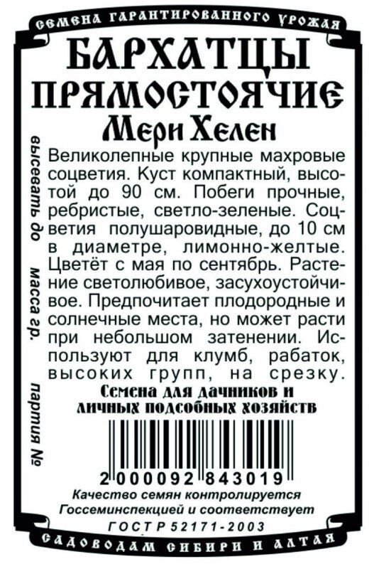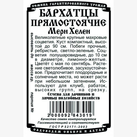 Однолетнее растение. Высота растения 90 см. Диаметр цветка 8 см.Крупные, золотисто-желтые цветки обладают эффектной внешностью и будут радовать до самой осени. Благодаря своей неприхотливости, замечательно растут в вазонах, контейнерах, балконных ящиках, бордюрах и прекрасно держат форму (не разваливаются от дождя и ветра), переносят понижение температуры без ущерба для красоты своих соцветий.