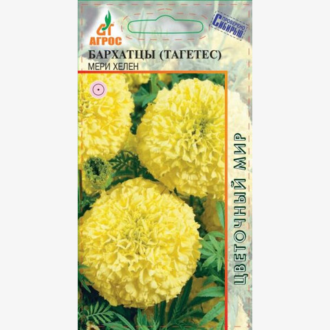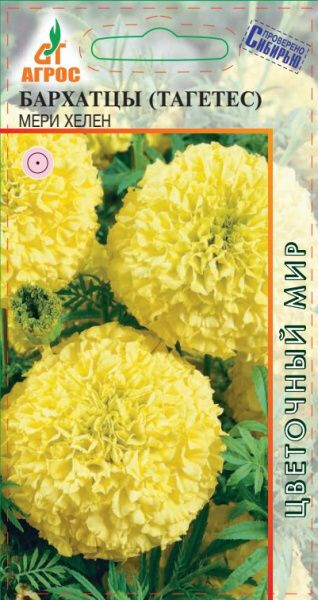 Однолетник. Превосходные крупные махровые соцветия, гвоздиковидные, до 10 см в диаметре, лимонно-желтые. Растение высотой до 90 см. Бархатцы неприхотливые, быстрорастущие, засухоустойчивые и светолюбивые, но выносят небольшое затенение. Поэтому ими можно оформлять участки с северной стороны строений. Семена на рассаду высевают в начале апреля, но для более раннего цветения их можно посеять на рассаду в марте. Всходы появляются через 10-14 дней при температуре 16-18 °С. В период выращивания рассады желательно сделать 2-3 подкормки комплексными минеральными удобрениями. В грунт высаживают, когда минует угроза заморозков. Бархатцы гармонично смотрятся в любых цветниках. Отлично подойдут для оформления заднего плана цветников, клумб, создания высоких бордюров. Долго сохраняют декоративность в срезке (до 15 дней). Кроме того, бархатцы оказывают санитарное воздействие на почву. 90 III-IV V V-VI 30x30 VI-IX