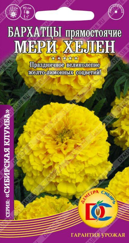 Удивительные высокорослые бархатцы с крупными, ярко-желтыми, густомахровыми соцветиями до 10 см. Кусты высотой до 90 см, сильноветвистые, с большим количеством цветоносов. Прекрасно держат форму и не разваливаются от дождя и ветра. Цветение раннее, обильное и продолжительное, с июля по октябрь. Отлично смотрятся в цветниках. Подходят для срезки, в воде стоят до 15 дней.