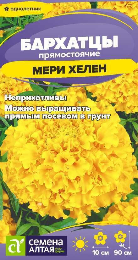 Высокорослый декоративный однолетник с крупными махровыми соцветиями. Образует мощный ветвистый куст высотой до 90 см, с множеством крепких цветоносов, увенчанных густомахровыми соцветиями роскошной золотисто-желтой окраски, диаметром до 10 см. Бархатцы прекрасно держат форму и не разваливаются от дождя и ветра. Отлично подойдут для оформления заднего плана цветников, клумб, создания высоких бордюров. Долго сохраняют декоративность в срезке (до 15 дней). Неприхотливое, засухоустойчивое и светолюбивое растение, выносит небольшое затенение. Заморозков не переносит. Наибольшей декоративности достигает на открытых солнечных участках с питательными нейтральными суглинистыми почвами. Посев семян на рассаду проводят в марте. Глубина заделки семян 0,5 см. Посевы накрывают плёнкой для поддержания необходимого уровня влажности. При температуре +20-22°С всходы появляются через 7-14 дней, затем пленку убирают, температуру понижают до +16-18°С, во избежание вытягивания рассады. Когда минует угроза возвратных заморозков проводят высадку в открытый грунт. Схема посадки 30х50 см. Цветение – через 2-2,5 месяца от посева, с июня до заморозков. В районах с мягким климатом возможен посев семян в открытый грунт в мае на глубину 1,0-1,5 см.