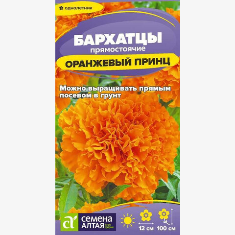 Высокорослый декоративный однолетник с очень крупными махровыми соцветиями. Образует мощный ветвистый куст высотой до 100 см, с множеством крепких цветоносов, увенчанных огромными густомахровыми соцветиями роскошной густо-оранжевой окраски, диаметром до 12 см. Отлично подойдет для оформления заднего плана цветников, клумб, создания высоких бордюров. Сорт долго сохраняет декоративность в срезке (до 15 дней). Неприхотливое, засухоустойчивое и светолюбивое растение, выносит небольшое затенение. Заморозков не переносит. Наибольшей декоративности достигает на открытых солнечных участках с питательными нейтральными суглинистыми почвами. Посев семян на рассаду проводят в марте. Глубина заделки семян 0,5 см. Посевы накрывают плёнкой для поддержания необходимого уровня влажности. При температуре +20-22°С всходы появляются через 7-14 дней, затем пленку убирают, температуру понижают до +16-18°С, во избежание вытягивания рассады. Когда минует угроза возвратных заморозков проводят высадку в открытый грунт. Схема посадки 30х50 см. Цветение – через 2-2,5 месяца от посева, с июня до заморозков. В районах с мягким климатом возможен посев семян в открытый грунт в мае на глубину 1,0-1,5 см.
