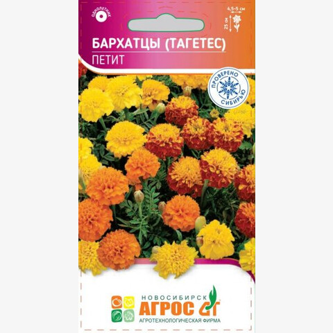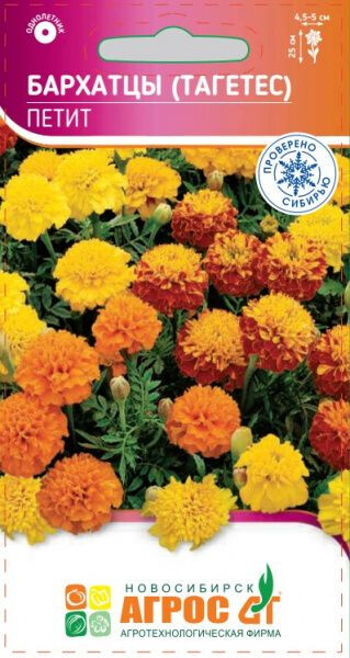 Однолетник. Серия Петит - лидер на рынке отклоненных бархатцев. Рано зацветает, обладает крупными махровыми гвоздиковидными цветками (4,5-5 см), разнообразных окрасок. Все растения выровнены по высоте и времени цветения. Бархатцы неприхотливые, быстрорастущие, засухоустойчивые и светолюбивые растения, но выносят небольшое затенение, поэтому ими можно оформлять участки с северной стороны строений. Семена на рассаду высевают в начале апреля, но для более раннего цветения их можно посеять в марте. Всходы появляются через 10-14 дней при температуре 16-18°С. В открытый грунт можно посеять в мае. В период выращивания рассады желательно сделать 2-3 подкормки комплексными минеральными удобрениями. В грунт высаживают, когда минует угроза заморозков. Бархатцы гармонично выглядят в любых цветниках. Их можно использовать в контейнерах и корзинах, высаживать в балконные ящики. Хорошо и долго стоят в срезке. Кроме того, бархатцы оказывают санитарное воздействие на почву. 25 III-IV V V-VI 20х20 VI-IX