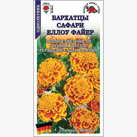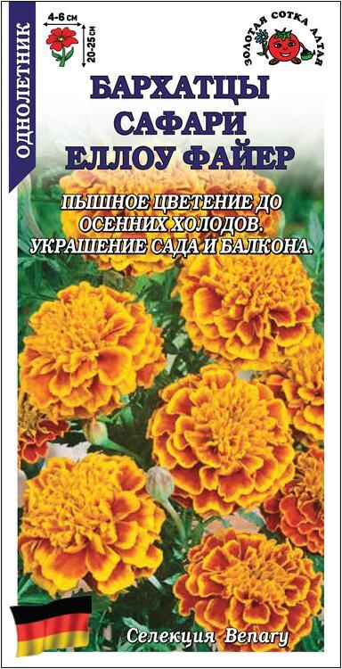 Бархатцы серии Сафари характеризуются энергичным развитием, ранним зацветанием и пышным цветением до осенних заморозков. Кустики низкорослые, объемные, с отличным ветвлением от основания. Цветки анемоновидные, крупные, махровые и полумахровые, выразительной желтой окраски с темно-красными мазками. Используют для оформления цветников и контейнеров в саду и на балконе.