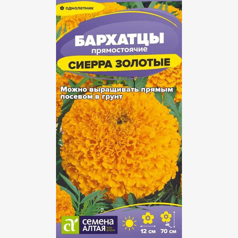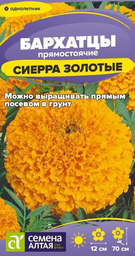 Высокорослые обильноцветущие бархатцы. Растения формируют плотные кустики высотой до 70 см с крепкими цветоносами. Роскошные, золотистого цвета густомахровые соцветия, диаметром до 12 см, будут отлично смотреться в цветочных аранжировках, на заднем плане цветников, великолепны в срезке. Бархатцы Сиерра прекрасно держат форму в течение всего сезона, устойчивы к воздействию ветра и дождя. Неприхотливое, засухоустойчивое и светолюбивое растение, выносит небольшое затенение. Заморозков не переносит. Наибольшей декоративности достигает на открытых солнечных участках с питательными нейтральными суглинистыми почвами. Посев семян на рассаду проводят в марте. Глубина заделки семян 0,5 см. Посевы накрывают плёнкой для поддержания необходимого уровня влажности. При температуре +20-22°С всходы появляются через 7-14 дней, затем пленку убирают, температуру понижают до +16-18°С, во избежание вытягивания рассады. Когда минует угроза возвратных заморозков проводят высадку в открытый грунт. Схема посадки 30х50 см. Цветение – через 2-2,5 месяца от посева, с июня до заморозков. В районах с мягким климатом возможен посев семян в открытый грунт в мае на глубину 1,0-1,5 см.