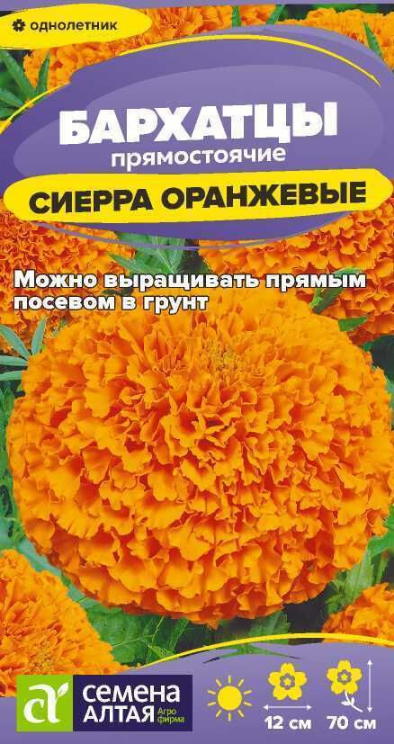 Высокорослые обильноцветущие бархатцы. Растения формируют плотные кустики высотой до 70 см с крепкими цветоносами. Роскошные, насыщенно-оранжевого цвета густомахровые соцветия, диаметром до 12 см, будут отлично смотреться в цветочных аранжировках, на заднем плане цветников, великолепны в срезке. Бархатцы Сиерра прекрасно держат форму в течение всего сезона, устойчивы к воздействию ветра и дождя. Неприхотливое, засухоустойчивое и светолюбивое растение, выносит небольшое затенение. Заморозков не переносит. Наибольшей декоративности достигает на открытых солнечных участках с питательными нейтральными суглинистыми почвами. Посев семян на рассаду проводят в марте. Глубина заделки семян 0,5 см. Посевы накрывают плёнкой для поддержания необходимого уровня влажности. При температуре +20-22°С всходы появляются через 7-14 дней, затем пленку убирают, температуру понижают до +16-18°С, во избежание вытягивания рассады. Когда минует угроза возвратных заморозков проводят высадку в открытый грунт. Схема посадки 30х50 см. Цветение – через 2-2,5 месяца от посева, с июня до заморозков. В районах с мягким климатом возможен посев семян в открытый грунт в мае на глубину 1,0-1,5 см.
