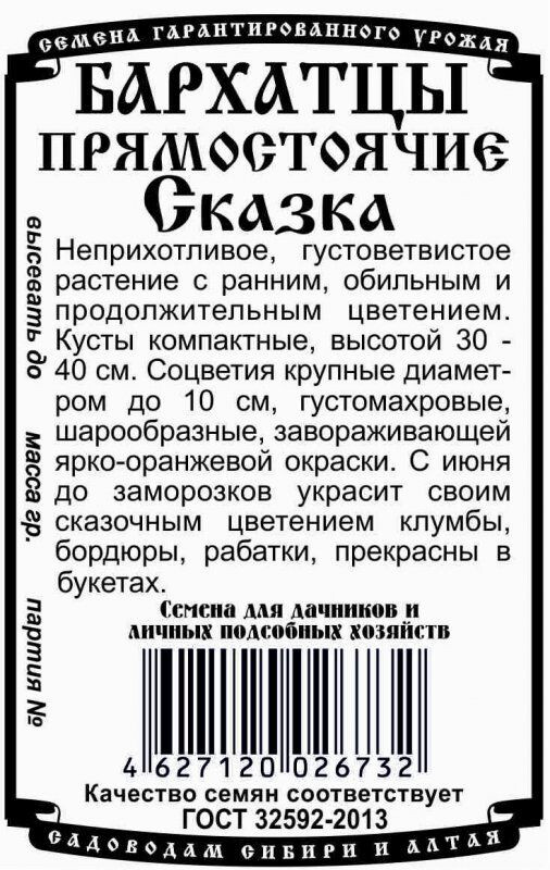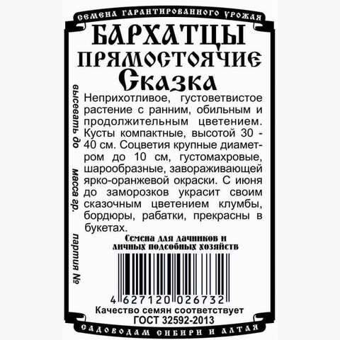 Неприхотливое, густоветвистое растение с ранним, обильным и продолжительным цветением. Кусты компактные, высотой 30 - 40 см. Соцветия крупные диаметром до 10 см, густомахровые, шарообразные, завораживающей ярко-оранжевой окраски. С июня до заморозков украсит своим сказочным цветением клумбы, бордюры, рабатки для бордюров, вазонов и контейнеров
