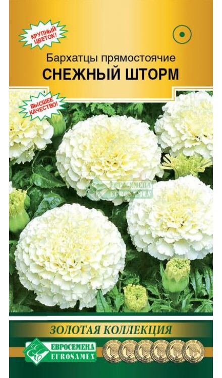 Бархатцы — любимые всеми цветы, которые дарят людям свою красоту и поднимают настроение яркими красками на протяжении всего лета. К тому же они неприхотливы. Родина их — американский континент. Бархатцами цветы назвали за нежные бархатистые лепестки. Другое название цветка Тагетес дано в честь бога Тагеса, который прославился своей красотой и провидческими способностями. Снежный Шторм- триумф в селекции прямостоячих бархатцев с изумительной окраской. Махровые соцветия бело-кремового цвета с более темной серединкой, с закрученными краями лепестков, неизменно привлекут к себе всеобщее внимание. Кусты компактные, сильные, растут и развиваются быстро. Соцветия в изобилии распускаются весь сезон, до первых осенних заморозков. Сорт неприхотливый, сохраняет декоративность под воздействием ветра и дождя. Превосходные растения для контейнеров, патио, клумб и рабаток, отличные помощники в заполнении промежутков между соседними растениями. Высота растения-30 см Диаметр цветка-8-10 см