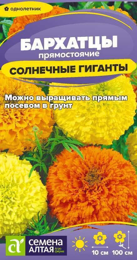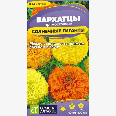 Высокорослые бархатцы с крупными махровыми соцветиями будут украшать Ваш сад с июня до самых заморозков. Растение неприхотливое, отличается длительным периодом цветения. Куст высотой до 100 см с явно выраженным главным побегом. Соцветия яркие крупные (10 см в диаметре) густомахровые различной окраски: оранжевой, золотисто-желтой и лимонно-желтой. Прекрасным фоном для ярких соцветий служит сочная зелень изящных перисто-рассеченных листьев. Отлично подойдут для оформления заднего плана цветников, клумб, создания высоких бордюров. Долго сохраняют декоративность в срезке (до 15 дней). Неприхотливое, засухоустойчивое и светолюбивое растение, выносит небольшое затенение. Заморозков не переносит. Наибольшей декоративности достигает на открытых солнечных участках с питательными нейтральными суглинистыми почвами. Посев семян на рассаду проводят в марте. Глубина заделки семян 0,5 см. Посевы накрывают плёнкой для поддержания необходимого уровня влажности. При температуре +20-22°С всходы появляются через 7-14 дней, затем пленку убирают, температуру понижают до +16-18°С, во избежание вытягивания рассады. Когда минует угроза возвратных заморозков проводят высадку в открытый грунт. Схема посадки 30х50 см. Цветение – через 2-2,5 месяца от посева, с июня до заморозков. В районах с мягким климатом возможен посев семян в открытый грунт в мае на глубину 1,0-1,5 см.
