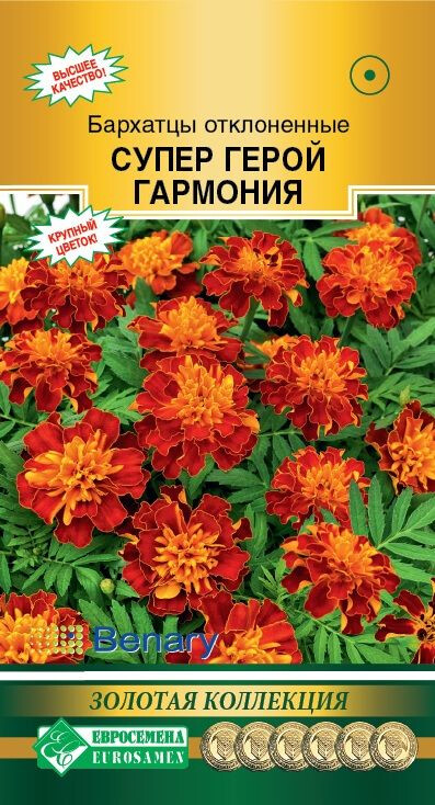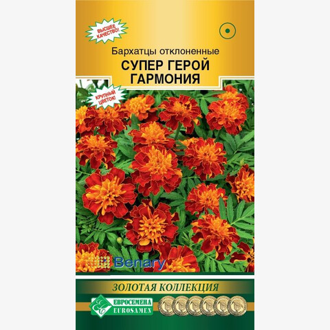 Удивительные бархатцы покорили не одно сердце садовода-любителя, даря людям свою красоту и поднимая настроение яркими красками на протяжении всего лета. Их популярность обусловлена красотой соцветий, неприхотливостью и простотой выращивания, поэтому именно бархатцы можно встретить чаще всего на дачных участках. Селекционеры просто неутомимы в создании все более новых и прекрасных сортов и гибридов этой однолетней культуры. Супер Герой Гармония- улучшенный сорт известной серии бархатцев Герой от немецкой компании Benary, появился на рынке семян пару лет назад, отличается эффектной внешностью соцветий, выравненностью растений, более крупным цветком и более ранним цветением. Восхитительные цветки лучатся, словно огоньки, яркой окраской на фоне сочной зелени, прекрасно заполняя промежутки между соседними растениями.