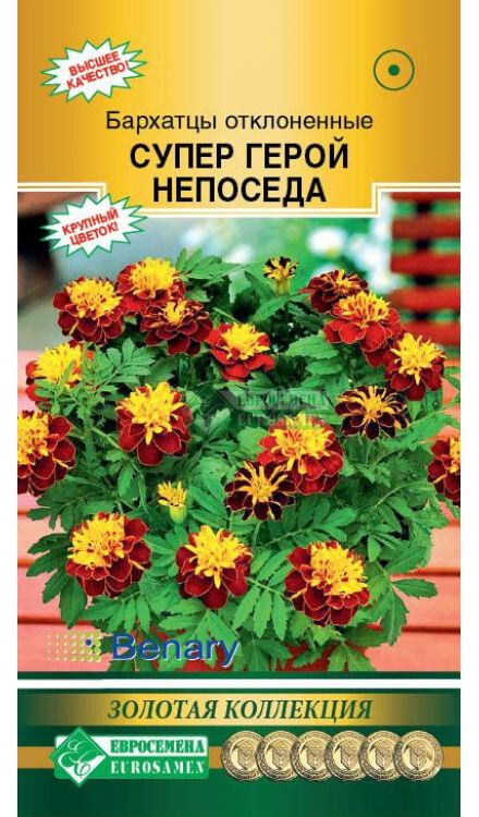 Tagetes patula Super Hero Spry Удивительные бархатцы покорили не одно сердце садовода-любителя, даря людям свою красоту и поднимая настроение яркими красками на протяжении всего лета. Их популярность обусловлена красотой соцветий, неприхотливостью и простотой выращивания, поэтому именно бархатцы можно встретить чаще всего на дачных участках. Селекционеры просто неутомимы в создании все более новых и прекрасных сортов и гибридов этой однолетней культуры. Супер Герой непоседа- улучшенный сорт известной серии бархатцев Hero от немецкой компании Benary, появился на рынке семян пару лет назад, отличается эффектной внешностью соцветий, выравненностью растений, более крупным цветком и более ранним цветением. Восхитительные цветки лучатся, словно огоньки, яркой окраской на фоне сочной зелени, прекрасно заполняя промежутки между соседними растениями. Высота растения-20 см Диаметр цветка-6 см
