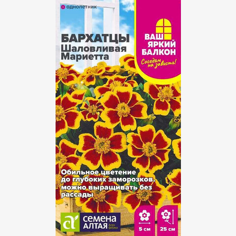 Яркие соцветия бархатцев этого низкорослого сорта будут украшать Ваш сад. Растение формирует компактный сильноветвистый кустик высотой до 25 см. Соцветия плоские немахровые, 4-5 см в диаметре. Окраска язычковых цветков двухцветная: золотисто-желтая с большим коричнево-красным пятном у основания. Трубчатые цветки оранжевые с коричневыми кончиками, образуют выпуклый хохолок в центре соцветия. Растение неприхотливое и отличается длительным периодом цветения. Применяется для одиночных и групповых посадок, декорирования рабаток, балконных ящиков и срезки. Неприхотливое, засухоустойчивое и светолюбивое растение, выносит небольшое затенение. Заморозков не переносит. Наибольшей декоративности достигает на открытых солнечных участках с питательными нейтральными суглинистыми почвами. Посев семян на рассаду проводят в марте. Глубина заделки семян 0,5 см. Посевы накрывают черной плёнкой для поддержания необходимого уровня влажности. При температуре +20-22°С всходы появляются через 7-10 дней, пленку убирают, температуру понижают до +16-18°С, во избежание вытягивания рассады. В грунт высаживают, когда минует угроза заморозков. Схема посадки 20х30 см. Цветение – через 2-2,5 месяца от посева, с июня до заморозков. В районах с мягким климатом возможен посев семян в открытый грунт в мае на глубину 1,0-1,5 см.