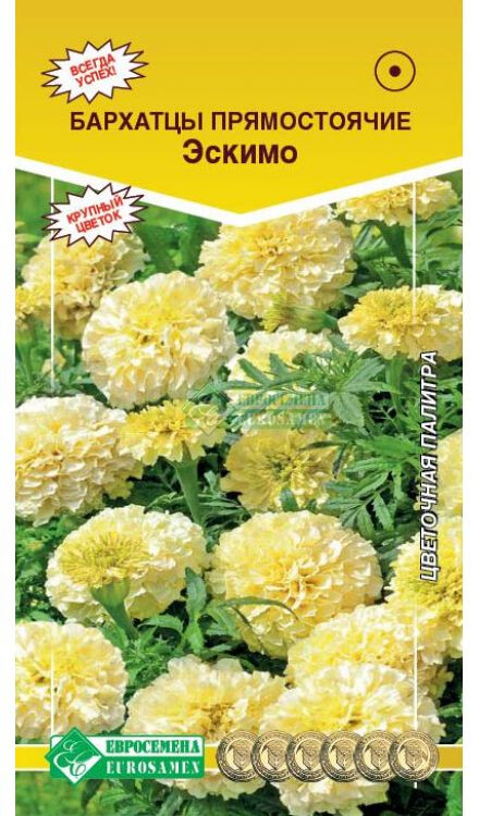 Бархатцы — любимые всеми цветы, которые дарят людям свою красоту и поднимают настроение яркими красками на протяжении всего лета. К тому же они неприхотливы. Родина их — американский континент. Бархатцами цветы назвали за нежные бархатистые лепестки. Другое название цветка Тагетес дано в честь бога Тагеса, который прославился своей красотой и способностью предвидеть. Эскимо- растение с густомахровыми соцветиями белой окраски, которые добавят приятной легкой прохлады в пылающие краски Вашего цветника, создадут ощущение свежести в жаркий летний день. Сорт уместен в цветниках любого типа, пригоден для контейнерной культуры в саду и на балконе. Как все бархатцы, растение неприхотливое, не доставят излишних хлопот при выращивании.