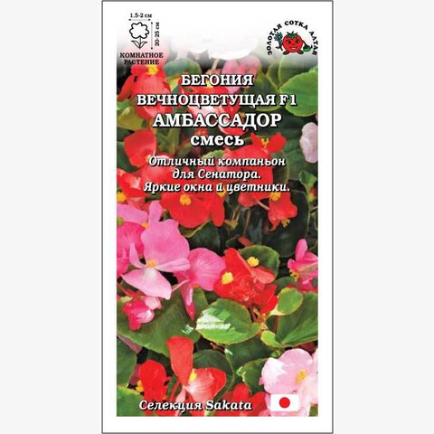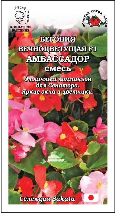 Бегонии Амбассадор образуют густые компактные кустики с зеленой листвой, зацветают рано, используются для украшения окон и цветников. Цветочки многочисленные, блестящие, ярких и нежных оттенков. Гибриды этой серии хорошо развиваются и обильно цветут даже на полутенистых участках, отлично сочетаются с темнолистной серией Сенатор.