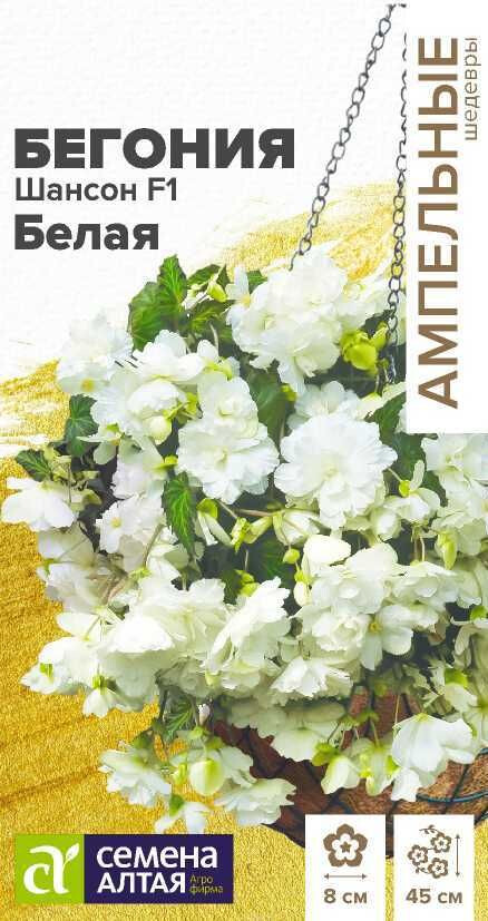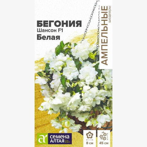 Ампельная бегония, формирует длинные побеги, усыпанные по всей длине крупными махровыми белыми цветками камелиевидной формы. Растение хорошо ветвится, образуя 5-8 ниспадающих побегов. Неприхотлива в уходе. Отлично подходит для подвесных корзин, вазонов, высоких кашпо и балконных ящиков. Длина плети: 30-45 см Диаметр цветка: 6-8 см Условия выращивания, место посадки: хорошо освещенные места Требования к грунту: питательный легкий грунт с нейтральной кислотностью Способы выращивания: рассадный Время посева на рассаду: декабрь-февраль Способ посева: семена высевают на уплотненное ложе замоченных торфяных таблеток или увлажненного грунта, не заделывая. Чтобы таблетки дольше не пересыхали, их можно поместить в лоток с вермикулитом. Емкость накрывают прозрачной крышкой или пленкой до появления первых всходов, обеспечивают круглосуточную досветку, периодически проветривают. Оптимальная температура +23…25°С. После появления первых всходов рекомендуется досвечивать 10-12 часов в сутки Время до появления всходов: 7-14 дней Перевалка: производится в стадии 4-6 настоящих листьев в рассадные емкости диаметром около 9 см, около 5-7 недели после посева. Последующие перевалки осуществляются по мере роста корневой системы. Для подвесного кашпо используются емкости не менее 30 см в диаметре. После перевалки требуется притенить растения на 2-3 дня Время высадки в открытый грунт, подвесные корзины: май-июнь Посадочное расстояние: 15-20 см Период цветения: май-октябрь, с 17-20 недели от посева Уход: полив на ранних этапах развития растений следует производить очень аккуратно, чтобы не повредить всходы. Для более обильного и длительного цветения в начале бутонизации подкармливают фосфорно-калийным удобрением, далее повторяют подкормки 1 раз в 2 недели. Осенью клубни можно выкопать и сохранить для посадки в следующем сезоне или продолжить выращивание растения в качестве комнатного Внимание! Семена в драже очень мелкие, оболочку не разрушать механически, а осторожно растворять опрыскиванием при посеве!