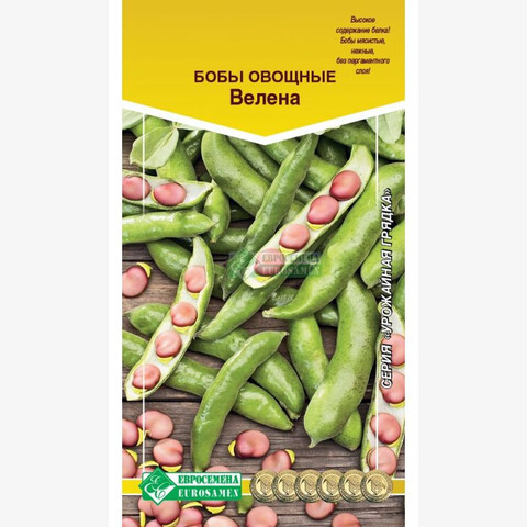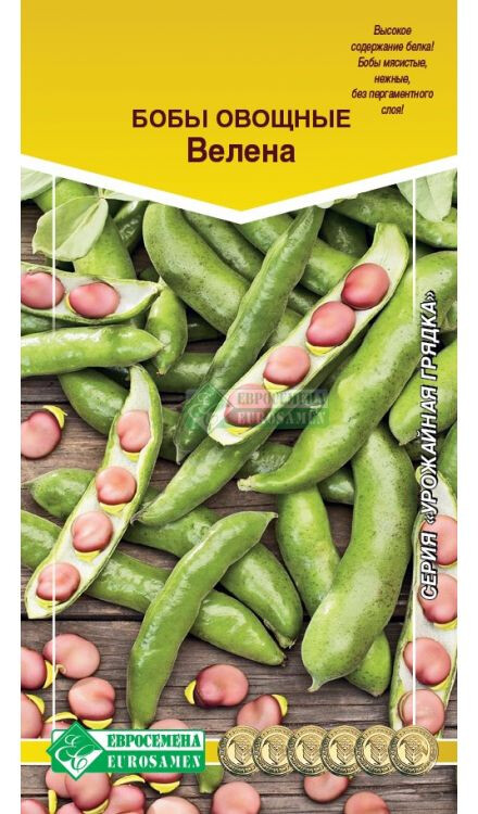 Бобы отличаются хорошими эстетическими и вкусовыми свойствами. В России польза бобов была хорошо известна еще до крещения Руси: благодаря ценному белку в составе, они не только занимали важное место в дневном рационе людей, но даже входили в стратегический запас страны. Велена- среднеранний высокоурожайный сорт с сахарными мясистыми бобами, от всходов до технической спелости 80-90 дней. Растение прямостоячее, слабоветвистое. Листья темно-зеленые, цветки белые с черным бархатистым пятном на крыльях, собраны в кисть по 6-8 штук. Боб сахарный, без пергаментного слоя, крупный, длиной 10-12 см, слегка изогнутый, тупоконечный, 3-4-семянный. Семена светло-палевые. Употребляются в фазу молочно-восковой спелости и созревшие зерна для тушения, консервирования, замораживания, особенно в диетическом питании. Семена высевают на глубину 5 см. Оптимальная для прорастания семян температура почвы 20-25С. Предназначены для консервирования и приготовления различных блюд.