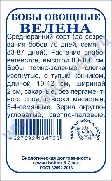 Среднеранний сорт (до созре- вания бобов 70 дней, семян - 83-87 дней). Растение слабо- ветвистое, высотой 80-100 см. Бобы темно-зеленые, слегка изогнутые, с тупым кончиком, длиной 10-12 см, шириной 2 см, сахарные, без пергамент- ного слоя, створки мясистые, 3-4-семянные. Зерна округло- угловатые, светло-палевые.