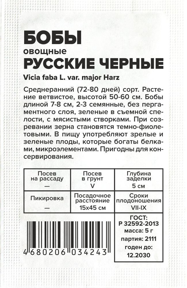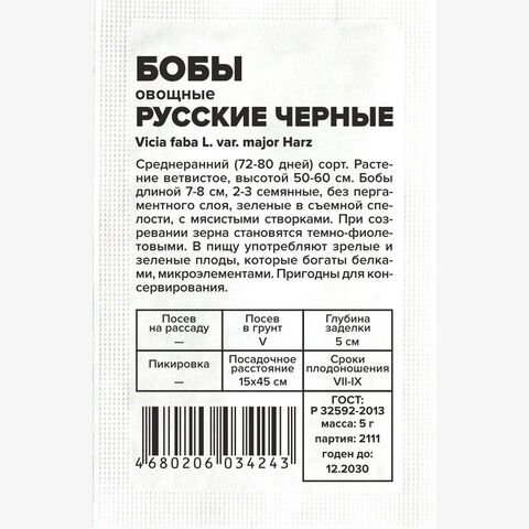 Среднеранний (72-80 дней) сорт. Растение ветвистое, высотой 50-60 см. Бобы длиной 7-8 см, 2-3 семянные, без пергаментного слоя, зеленые в съемной спелости, с мясистыми створками. При созревании зерна становятся темно-фиолетовыми. В пищу употребляют зрелые и зеленые плоды, которые богаты белками, микроэлементами. Пригодны для консервирования. Кроме пищевого направления бобы можно использовать как зеленые удобрения на сидераты, для обогащения почвы азотом. Место посадки: предпочитает плодородные очень легкие и легкие почвы с нейтральной или слабокислой реакцией. Требовательны к влаге. Бобы накапливают в почве азот, поэтому их можно располагать на истощенных почвах, после картофеля, моркови, лука, томатов Освещение: предпочитает солнечные участки, выносит затенение Предпосевная подготовка: не требуется, возможно замачивание на сутки Сроки посева: при прогревании почвы на глубине 10-15 см до +10..12°С (апрель-июнь) Посев на рассаду: не предусмотрено Посев в грунт: семена располагают в бороздки глубиной 4-6 см (чем крупнее семена, тем глубже), присыпают грунтом, хорошо уплотняют и проводят обильный полив теплой водой. В засушливый период посевы накрывают укрывным материалом для сохранения влаги. Расстояние между растениями не менее 15 см, между рядками 45 см Пикировка/перевалка: не требуется, сеют сразу в грунт Уход: полив регулярный, обильный. Обязательно бороться с сорняками, особенно вьющимися. Для высокорослых сортов рекомендуется создавать опору