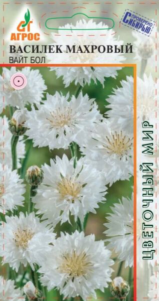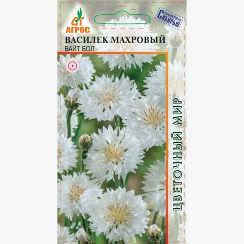 Красивое однолетнее растение с прямостоячим, сильно ветвящимся стеблем. Соцветия – корзинки диаметром 5-7 см, белого цвета. Василек холодостоек, светолюбив, очень неприхотлив. Хорошо развивается на небогатых почвах, содержащих известь. Чтобы цветение было продолжительным и обильным, в жаркую, сухую погоду растения необходимо поливать. Семена высевают сразу на постоянное место, на глубину 0,5- 1 см, с последующим прореживанием. Всходы появляются через 10-14 дней. Температура оптимальная для всходов – +18 °С. Возможен подзимний посев. Васильки прекрасно смотрятся на клумбах, в миксбордерах. Из них можно делать бордюры и рабатки либо высаживать отдельными группами и массивами. Хорошо стоят в срезке, а также являются красильным, лекарственным и медоносным растением. 70-80 - IV-V;IX-X - 15-20 VI-IX
