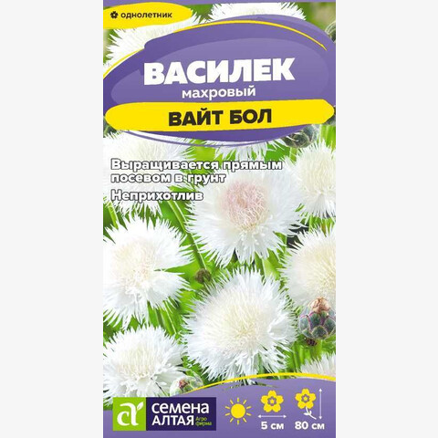 Декоративно-цветущий однолетник, создающий в саду настроение настоящего русского лета. Растение высокорослое, до 80 см, разветвленное, несущее на концах побегов множество белоснежных махровых соцветий до 5 см в диаметре. Особенность сорта – характерная шаровидная форма соцветий. Василек – отличный медонос, также он обладает ценными лекарственными свойствами: его отвар применяют, чтобы снять усталость с глаз, при фурункулах, цистите и многих других заболеваниях. Прекрасно подойдет для высоких бордюров, цветников в ландшафтном стиле, используется для оформления клумб, в групповых посадках, на каменистых горках, для срезки. Светолюбивое, холодостойкое, засухоустойчивое растение. Неприхотливо, но предпочитает открытые солнечные участки на рыхлых питательных нейтральных почвах. Выращивают посевом семян в открытый грунт в конце апреля – начале мая, как только почва прогреется до +3-5°C. Холодов и кратковременных ночных заморозков растения не боятся. Возможен и подзимний посев в октябре при температуре близкой к нулю. Семена высевают в бороздки глубиной 1,5-2 см, предварительно пролитые водой. Сеют с шагом в 5-7 см, мульчируют слоем почвы 0,3-0,5 см и поливают. Всходы появляются через 7-14 дней. Спустя 2-3 недели всходы прореживают с интервалом 35-40 см между растениями. Уход заключается в рыхлении, прополке и поливе 1 раз в 3-4 дня, однако во влажную погоду поливы сокращают, так как растение не переносит переувлажнения. Цветение обильное и продолжительное, с июня до сентября. Для продления цветения увядшие корзинки удаляют.