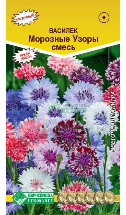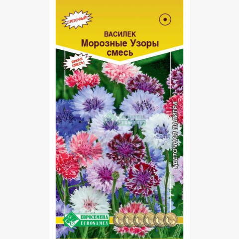 Centaurea cyanus Frosty mixed Яркая срезочная смесь быстрорастущего неприхотливого однолетника, обильно и продолжительно цветущего до заморозков. Высокие кусты несут большое количество махровых, ажурных соцветий-корзинок самой разнообразной окраски. Цветки двухцветные, с белой каймой по краю лепестков, смотрятся свежо и ярко. Для формирования большей кустистости растения прищипывают. Растения холодостойкие, засухоустойчивые, используются для посадки на клумбах, в группах, миксбордерах, рабатках, а также для получения срезки. Срезанные соцветия сохраняют декоративность в течение 5-7 дней. Отличный медонос, обладающий рядом лекарственных свойств. Высота растения-80 см Диаметр цветка-5 см