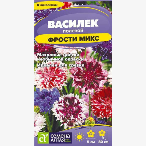 Специальная однолетняя смесь васильков с оригинальной двухцветной, словно тронутой морозом, окраской цветков. Прямостоячее растение, высотой до 80 см, с ланцетовидными листьями и крупными, до 4-5 см в диаметре, махровыми соцветиями различных оттенков, с белыми, словно покрытыми инеем, кончиками лепестков. Используется для оформления клумб, в групповых посадках, на каменистых горках, для срезки. Обладает ценными лекарственными свойствами. Светолюбивое, холодостойкое, засухоустойчивое растение. Неприхотливо, но предпочитает открытые солнечные участки на рыхлых питательных нейтральных почвах. Выращивают посевом семян в открытый грунт в конце апреля – начале мая, как только почва прогреется до +3-5°C. Холодов и кратковременных ночных заморозков растения не боятся. Возможен и подзимний посев в октябре при температуре близкой к нулю. Семена высевают в бороздки глубиной 1,5-2 см, предварительно пролитые водой. Сеют с шагом в 5-7 см, мульчируют слоем почвы 0,3-0,5 см и поливают. Всходы появляются через 7-14 дней. Спустя 2-3 недели всходы прореживают с интервалом 35-40 см между растениями. Уход заключается в рыхлении, прополке и поливе 1 раз в 3-4 дня, однако во влажную погоду поливы сокращают, так как растение не переносит переувлажнения. Цветение обильное и продолжительное, с июня до сентября. Для продления цветения увядшие корзинки удаляют.