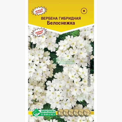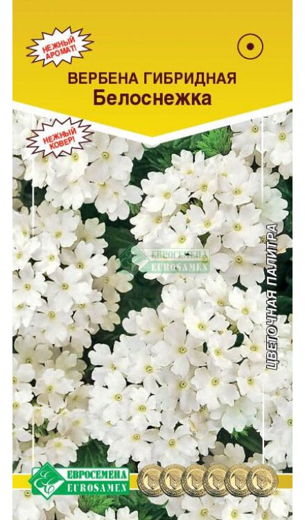 Вербена - превосходный обильно цветущий однолетник с приятным ароматом. Цветки правильной формы, диаметром 1-2 см, ароматные, собраны в зонтиковидные соцветия. Компактное растение вербены с крупными шапками соцветий нежнейшей освежающей белой окраски. К вечеру от цветков исходит нежный аромат. По продолжительности цветения она занимает одно из первых мест в сегменте однолетних растений. Стойко переносит суровые условия маленького объема почвы, идеально растет в вазонах, контейнерах, создавая настоящие шедевры из своих восхитительных цветков вплоть до заморозков. Цветочный ковер из вербены выглядит впечатляюще, она отличный помощник в создании оригинальных цветочных ансамблей. Хорошо сочетается с такими культурами, как: львиный зев, петуния, алиссум (лобулярия) темных окрасок.