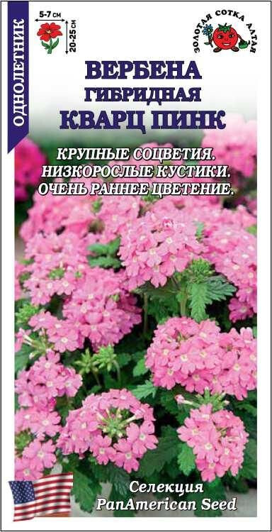 Вербены серии Кварц устойчивы к непо- годе, однородны по высоте и времени зацветания, обильно цветут с июня по октябрь. Кустики низкорослые, ветви- стые, объемные, с множеством цвето- носов. Миниатюрные нежно-розовые цветочки собраны в крупные соцветия. Вербена хороша как в гордом одиноче- стве, так и в компании с другими цвета- ми, прекрасно подходит для цветников и вазонов.
