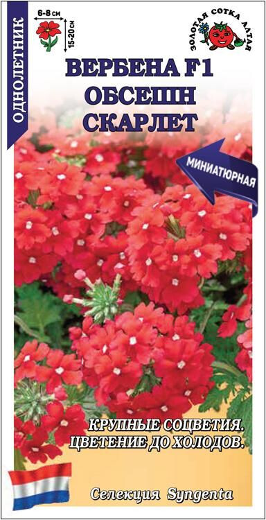 Миниатюрная вербена, образующая пышный, хорошо ветвящийся от основания кустик с множеством крепких побегов, устойчивых к вытягиванию. Цветочки мелкие, красные, собраны в крупные соцветия. Вербены серии Обсешн зацветают очень рано и обильно цветут все лето даже при высокой плотности посадок. Великолепны в цветниках, особенно хороши в кашпо, вазонах и ящиках.