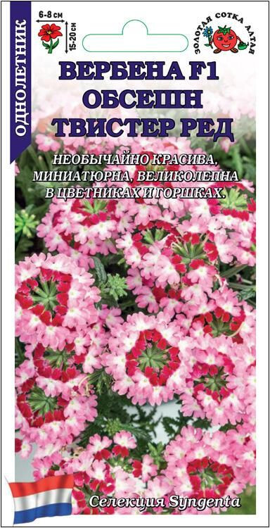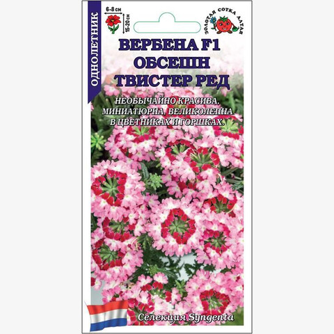 Необычайно красивая представительница серии Обсешн. Миниатюрные растения прекрасно ветвятся и разрастаются в пышный кустик шириной 40-60 см. Мелкие красно-розовые цветочки с белым размытым центром собраны в соцветия-шарики, венчающие многочисленные крепкие цветоносы. Вербены данной серии зацветают очень рано и обильно цветут до осени даже при загущенных посадках. Великолепны в цветниках и горшках.