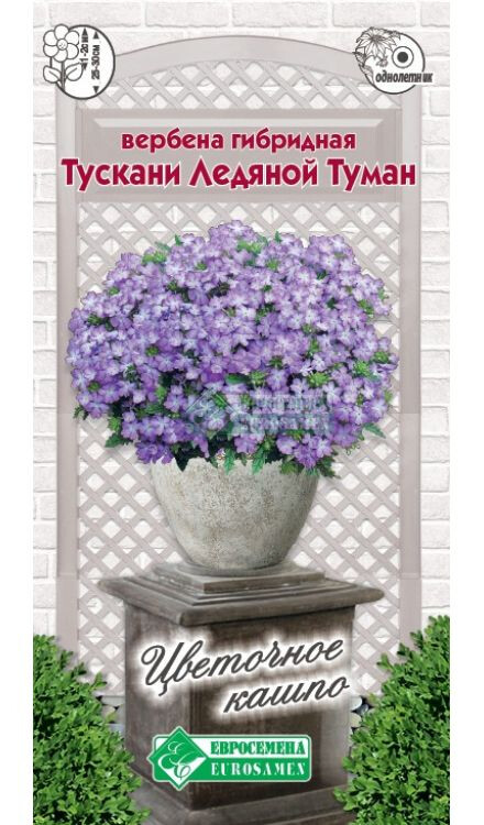 Вербена гибридная представляет собой небольшой кустарник с крупными соцветиями округлой формы. У нее множество сортов, основные различия заключаются лишь в высоте кустиков, окраске цветков, типе побегов. Растения крепкие, с красивым сочным окрасом и отличным боковым ветвлением. Отличается обильным и продолжительным цветением, бутоны распускаются все лето. Цветки у Тускани Ледяной Туман эффектные, двухцветные, лавандово-белой окраски, собраны в крупные зонтиковидные соцветия и к вечеру источают нежный аромат. Она стойко переносит суровые условия маленького объема почвы, идеально растет в вазонах, контейнерах, создавая настоящие шедевры из своих восхитительных цветков вплоть до заморозков. Отличный помощник в создании оригинальных цветочных ансамблей, замечательно покажет себя как на жарком юге, так и в условиях прохладного северного лета.