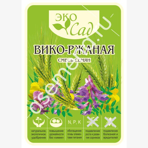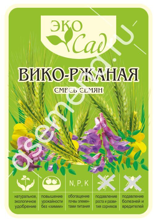(вика яровая —30%, рожь озимая —70%) Сидерат —экологически чистое органическое удобрение, выращиваемое для последующей заделки в почву с целью улучшения ее структуры, обогащения азотом и микроэлементами, способствует накоплению гумуса. Обладает фитосанитарным свойством —снижает заболеваемость растений, активно подавляет нематоды, снижает численность проволочника, угнетает рост сорняков. Агротехника: смесь высевают осенью. Глубина заделки семян 5 см. Семена начинают прорастать при t 2-3°C, переносят заморозки до -7°С. Весной рекомендуется боронование. Зацветает через 30-35 дней от начала весенней вегетации. Отросшую зеленую массу скашивают и заделывают в почву на глубину 5-7 см ОБЯЗАТЕЛЬНО ДО НАЧАЛА БУТОНИЗАЦИИ!