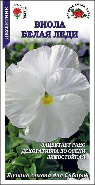 Очаровательная виола с крупными белоснежными цветами. Сорт зимостойкий, неприхотливый, развивается быстро, зацветает рано и цветет обильно, сохраняя декоративный внешний вид до осени. Виола отлично переносит пересадку в цветущем виде. Используется для создания различных цветников, великолепно смотрится в тротуарных вазах, подвесных горшках и ящиках.