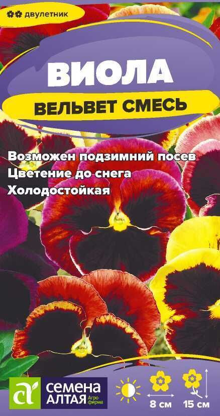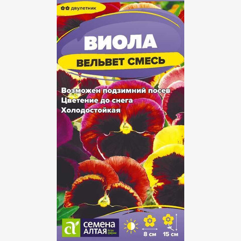 Очаровательная смесь! Яркие цветки с каймой различной окраски и большим темным пятном в центре. Смесь отличается зимостойкостью, более ранним цветением и компактной формой куста, быстрым и стабильным ростом в различных условиях выращивания. Виола, или Анютины глазки, относится к самым рано и продолжительно цветущим растениям. Широко используется в ковровых посадках на клумбах и в бордюрах, отлично смотрится в оконных и балконных ящиках, вазонах и кашпо. Неприхотливое зимо- и холодостойкое растение, предпочитает открытые солнечные участки, но может расти в полутени. Предпочитает плодородные почвы с добавлением песка. При выращивании в качестве двулетника семена на рассаду высевают в мае-июле на разводочные гряды. В конце августа – начале сентября подросшие сеянцы высаживают на постоянное место. Для получения растений, цветущих в год посева, семена высевают в феврале-марте в рассадные ящики. Для лучшей всхожести можно провести стратификацию в течение 2 недель. Семена раскладывают на увлажненный грунт с интервалом 2 см и присыпают землей слоем 3 мм. Посевы увлажняют, накрывают прозрачной пленкой или стеклом, помещают в тёплое (+20-25оС) светлое место, периодически проветривают. При появлении всходов, через 7-10 дней, укрытие снимают. При образовании двух настоящих листиков проводят перевалку в отдельные емкости. В открытый грунт рассаду высаживают в конце мая – июне. Посадочный интервал 15-20 см. Возможен подзимний посев сухими семенами в грунт. Цветение при выращивании рассадой с июня до заморозков, при посеве семян в грунт – на следующий год с ранней весны и до поздней осени. Зимует под снежным укрытием. Может размножаться самосевом. Для лучшей зимовки рекомендуется проведение фосфорно-калийных подкормок в конце лета, весной – подкормки комплексным удобрением.