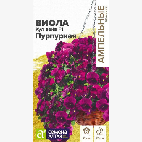 Холодостойкий раннецветущий гибрид ампельной виолы. Быстро наращивает побеги, зацветает в год посева, цветение длится до глубоких заморозков. Цветки глубокой пурпурной окраски. Выращивается в подвесных кашпо, балконных ящиках, а также в качестве почвопокровного растения. Длина плети: 60-75 см. Диаметр цветка: 4-6 см. Условия выращивания, место посадки: хорошо освещенные места Требования к грунту: питательный легкий грунт (рекомендуется добавить вермикулит), слабокислый Способы выращивания: рассадный Время посева на рассаду: февраль-март Способ посева: семена высевают на уплотненное ложе замоченных торфяных таблеток или увлажненного грунта, заделывая на глубину 0,2-0,3 см. Емкость накрывают прозрачной крышкой или пленкой до появления первых всходов, периодически проветривают. Оптимальная температура для прорастания +21…24°С. После появления первых всходов рекомендуется организовать досветку 10-12 часов в сутки. Оптимальная температура для молодых растений +18…22°С. Время до появления всходов: 2-5 дней Перевалка: производится в стадии 2-4 настоящих листьев в рассадные емкости диаметром около 9 см, 4-5 неделя после посева. Последующие перевалки осуществляются по мере роста корневой системы, больший объем грунта способствует росту боковых побегов и более активному цветению. Для подвесного кашпо используются емкости не менее 25-30 см в диаметре. Время высадки в открытый грунт: май, не ранее 6-7 недели от посева Посадочное расстояние: 25-30 см Период цветения: апрель-ноябрь, с 8 недели от полных всходов Уход: необходим регулярный полив. Первую подкормку проводят в начале бутонизации сульфатом калия. Внимание! Семена праймированные, не требуют дополнительных обработок перед посевом!