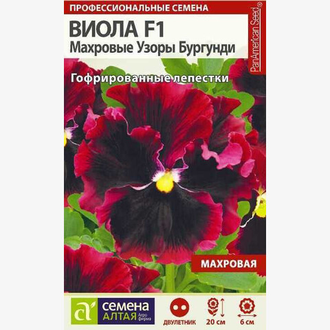 Уникальный гибрид виолы с роскошными бордовыми супергофрированными цветками. Растение формирует компактный ровный габитус, предпочитает легкую полутень и прохладу, которая усиливает гофрированность лепестков. Раннее цветение, выровненная форма куста и устойчивость к неблагоприятным погодным условиям делают виолу серии Махровые узоры незаменимой при оформлении контейнеров, вазонов. Прекрасно подойдет для выращивания на клумбах, бордюрах и альпийских горках. При выращивании как двулетника, семена на рассаду высевают в мае-июле на разводочные гряды. В конце августа - начале сентября подросшие сеянцы высаживают на постоянное место. Посадочный интервал 15-20 см. Для получения растений, цветущих в год посева, семена на рассаду высевают в феврале-марте, слегка заделывая. Для получения наилучшего результата посев рекомендуем проводить в торфяные таблетки (одно семя в таблетку). Посевы увлажняют и накрывают прозрачной плёнкой. Ёмкость помещают в тёплое светлое место с температурой +20-25оС. Пленку периодически снимают для проветривания. Всходы появляются через 7-10 суток. В первые дни сеянцы проветривают 2 раза в сутки по 20-30 минут, постепенно увеличивая временной интервал, полностью пленку снимают только через неделю. Пикировка на 7-9 неделе в подвесные кашпо ?25-30 см. Растения беречь от попадания прямых солнечных лучей. На зиму растения прикапывают в грунт и укрывают. Цветение при выращивании рассадой с августа до заморозков, при посеве семян в грунт – на следующий год с ранней весны до поздней осени. Внимание! Семена дражированные - оболочку драже не разрушать!