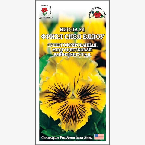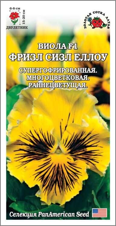 Виолы серии Фризл Сизл зацветают рано, цветут обильно и длительно, предпочитают легкую полутень и прохладу, при которой гофрированность лепестков усиливается. Кустики компактные, объемные. Цветы многочисленные, крупные, солнечно-желтого цвета с черными штрихами в центре. Виолы используются для ландшафтного озеленения, красиво смотрятся в контейнерах.