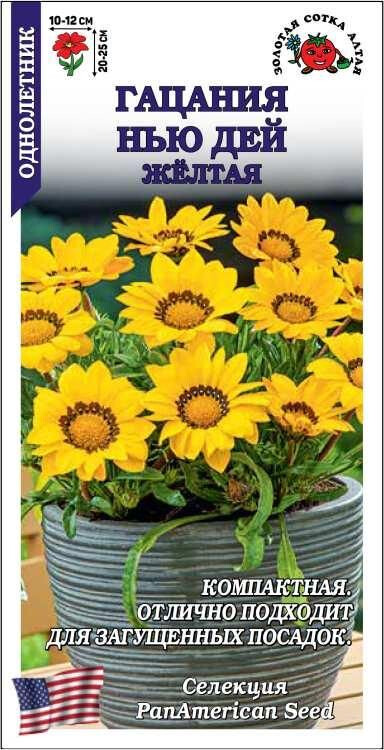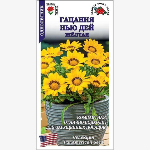 Гацании серии New Day компактны, отличаются простотой выращивания, отлично подходят для загущенных посадок, держат цветок открытым до позднего вечера. Кустик крепкий, ветвистый, шириной 15-20 см. Очень крупные солнечно-желтые соцветия с темным кольцом вокруг центра придают неповторимое очарование клумбам, бордюрам, каменистым горкам, украшают вазоны, кашпо и ящики.