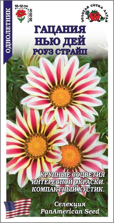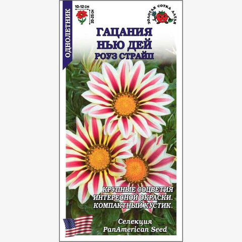 Гацании серии New Day компактны, просты в выращивании, отлично подходят для загущенных посадок, держат цветок открытым до позднего вечера. Кустик крепкий, ветвящийся, шириной 15-20 см. Соцветия необыкновенно красивые, очень крупные, с темным кольцом вокруг центра и полосатой бело-розовой окраской лепестков. Используют для украшения цветников, высаживают в вазоны и кашпо.