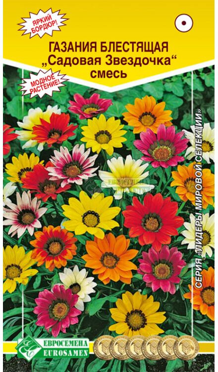 Яркая красотка! Отличная смесь с удачно подобранными расцветками газани садовой. Особая прелесть цветков - темные пятна, создающие в центре цветка очерченные кольцевые рисунки. Растение компактное, высотой около 20 см, с прочными цветоносами. Листья линейные и пальчато-рассеченные, зеленые с серебристым опушением, собраны в прикорневую розетку. На концах цветоносов распускаются соцветия, эффектные и крупные, 7-8 см в диаметре. Цветет с июня до заморозков. Используют в самых различных цветниках, как бордюрное растение, и как почвопокровник. Отлично сочетается с белым и синим агератумами.