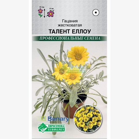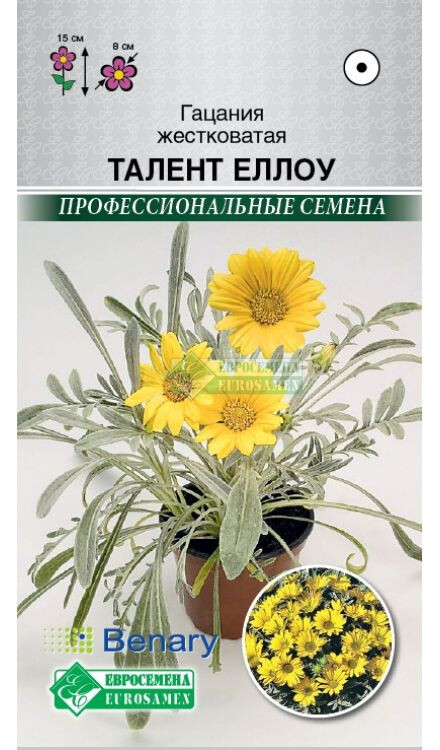 Уникальная серия гацании с серебристой листвой, которая не закрывает свои цветки даже в пасмурную погоду. 'Talent Yellow' -отличный горшечный сорт, с компактным шаровидным габитусом и крепкими соцветиями желтой окраски, продолжительностью выращивания 12-15 недель. Отличается беспрерывным образованием новых соцветий. Соцветия-корзинки по одному сидят на цветоносах, внешняя сторона лепестков белого цвета, а внутренняя их часть несет на себе кольцо лимонно-желтого цвета. Листья снизу ворсистые, серебристо-белые. Зацветает рано и цветет длительное время, хорошо переносит засуху, а также плохую погоду, сохраняя декоративность даже холодным дождливым летом, ее можно пересаживать во время цветения. Хорошо смотрится в самой разной посуде: цветочных горшках, оконных ящиках и является отличным украшением альпинариев, рокариев и бордюров.