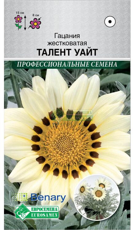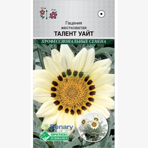 Уникальная серия гацании с серебристой листвой, которая не закрывает свои цветки даже в пасмурную погоду. 'Talent White' -отличный горшечный сорт, с компактным шаровидным габитусом и крепкими соцветиями белой окраски, продолжительностью выращивания 12-15 недель. Отличается беспрерывным образованием новых соцветий. Соцветия-корзинки по одному сидят на цветоносах, внешняя сторона лепестков белого цвета, а внутренняя их часть несет на себе кольцо коричневого цвета. Листья снизу ворсистые, серебристо-белые. Зацветает рано и цветет длительное время, хорошо переносит засуху, а также плохую погоду, сохраняя декоративность даже холодным дождливым летом, ее можно пересаживать во время цветения. Хорошо смотрится в самой разной посуде: цветочных горшках, оконных ящиках и является отличным украшением альпинариев, рокариев и бордюров. Высота растения-15 см Диаметр цветка-8 см